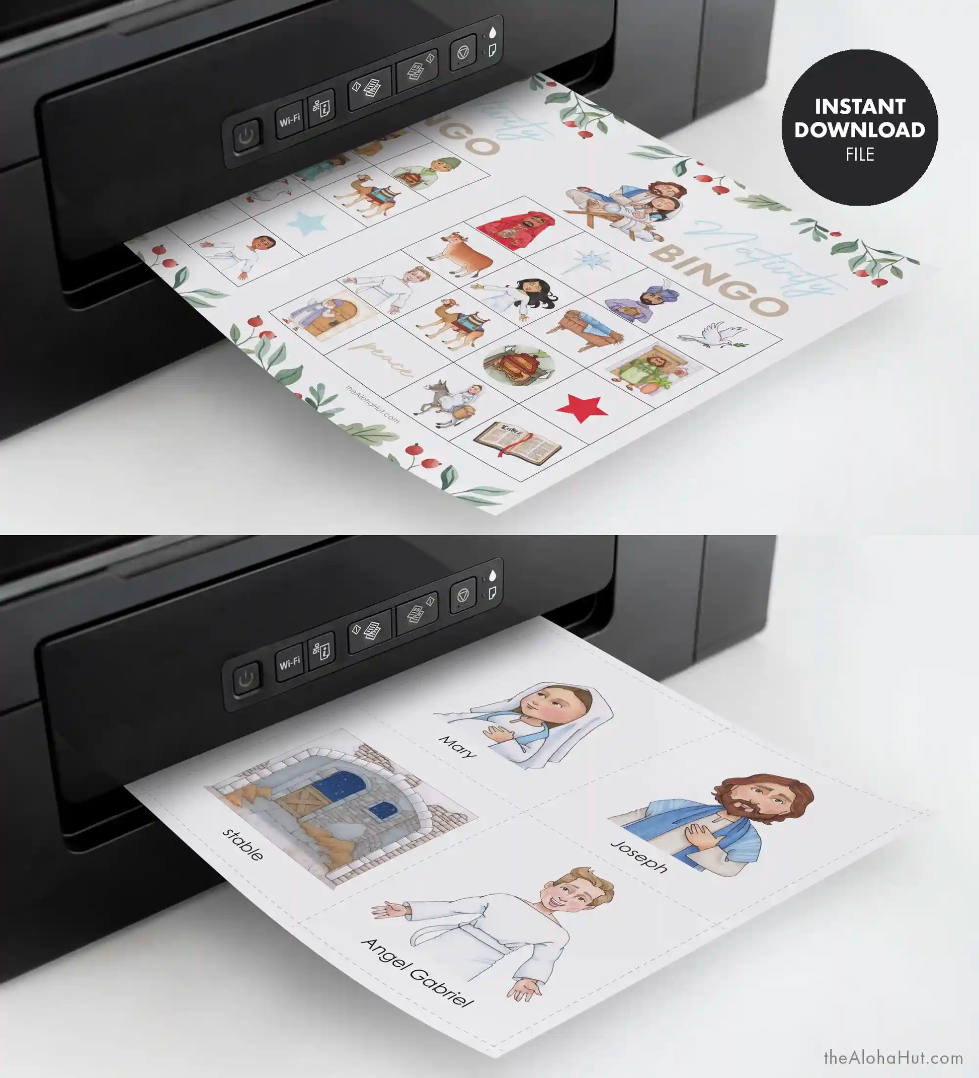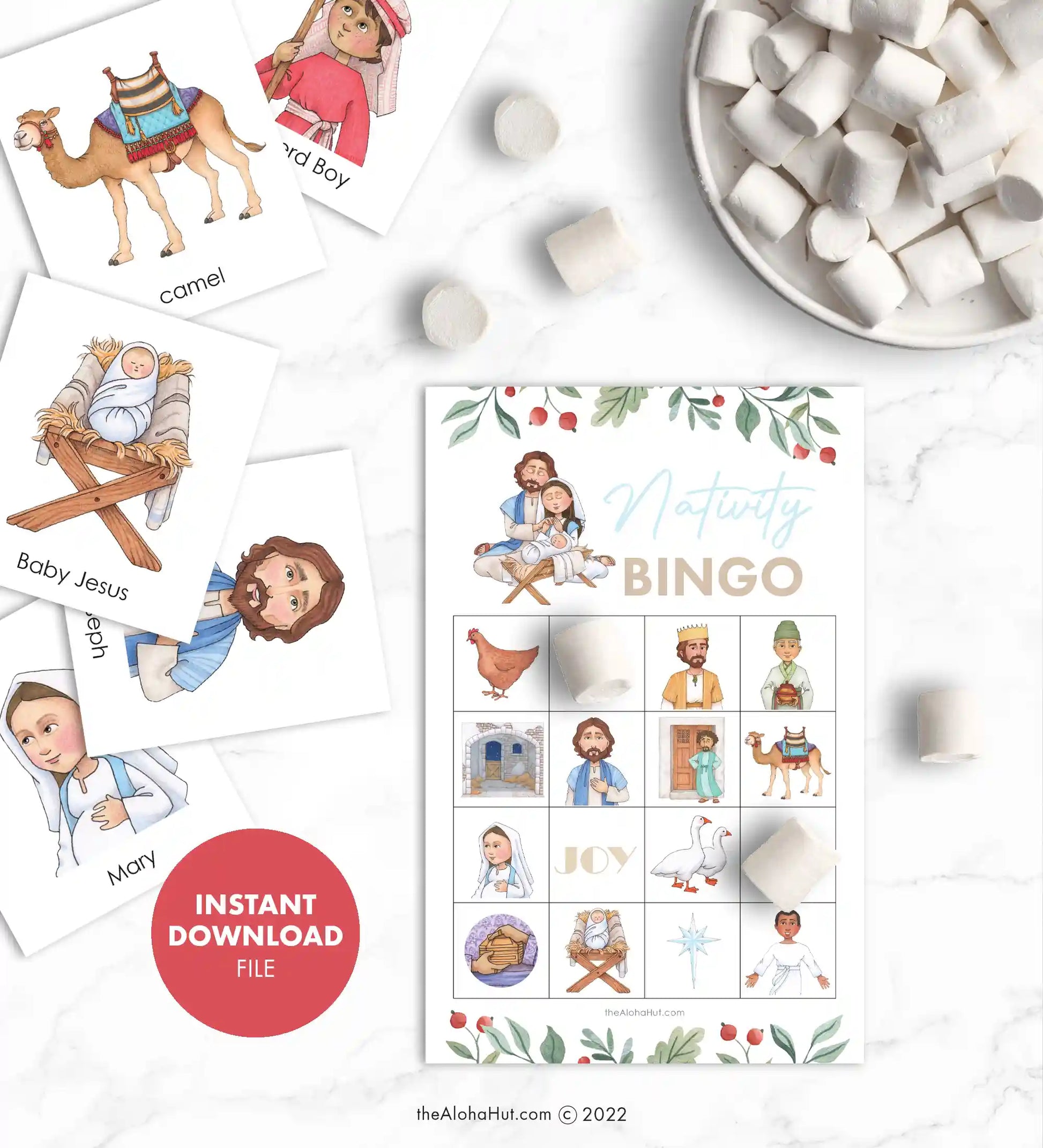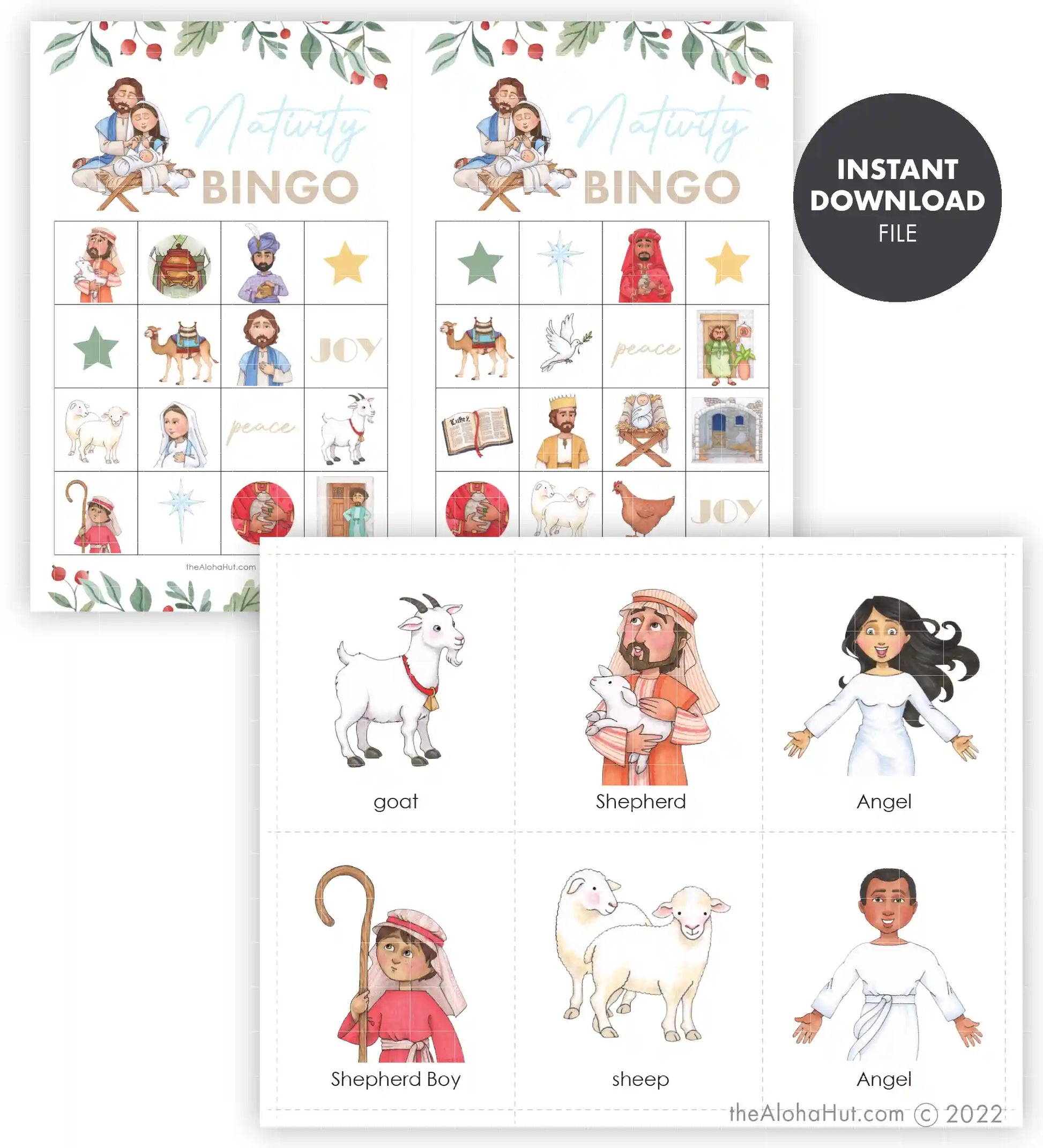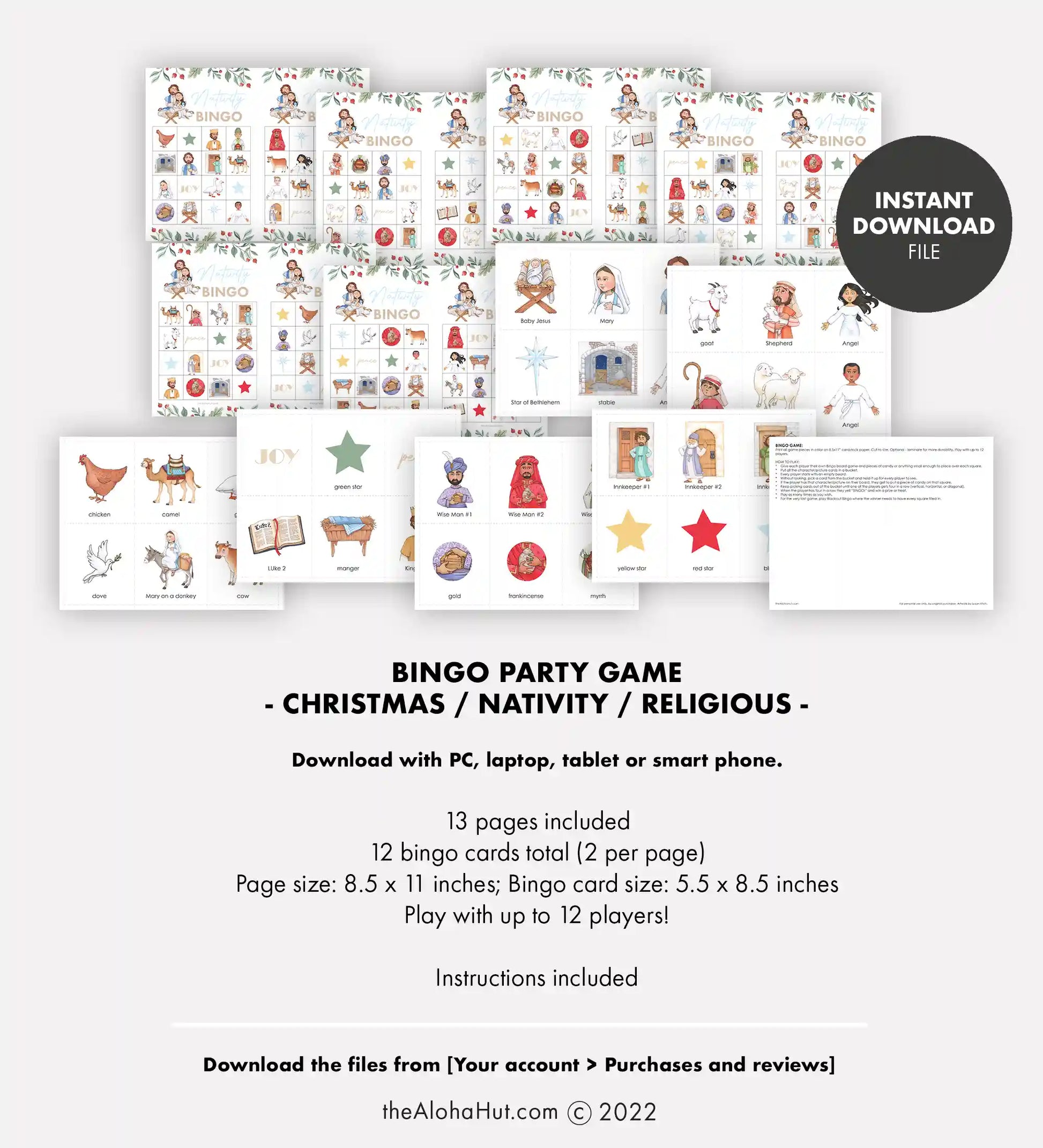- A high resolution, pdf file with 12 Nativity BINGO game boards / sheets and the picture cards for playing the game. Includes simple instructions for assembling and playing. Files are sized 8.5x11".