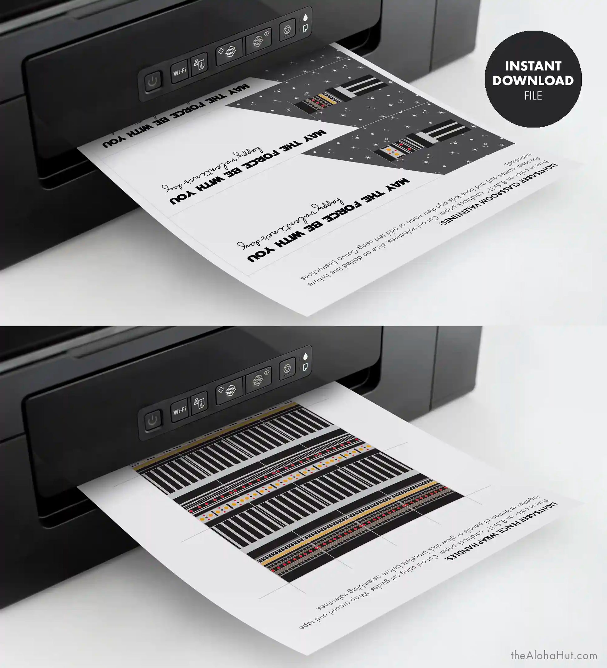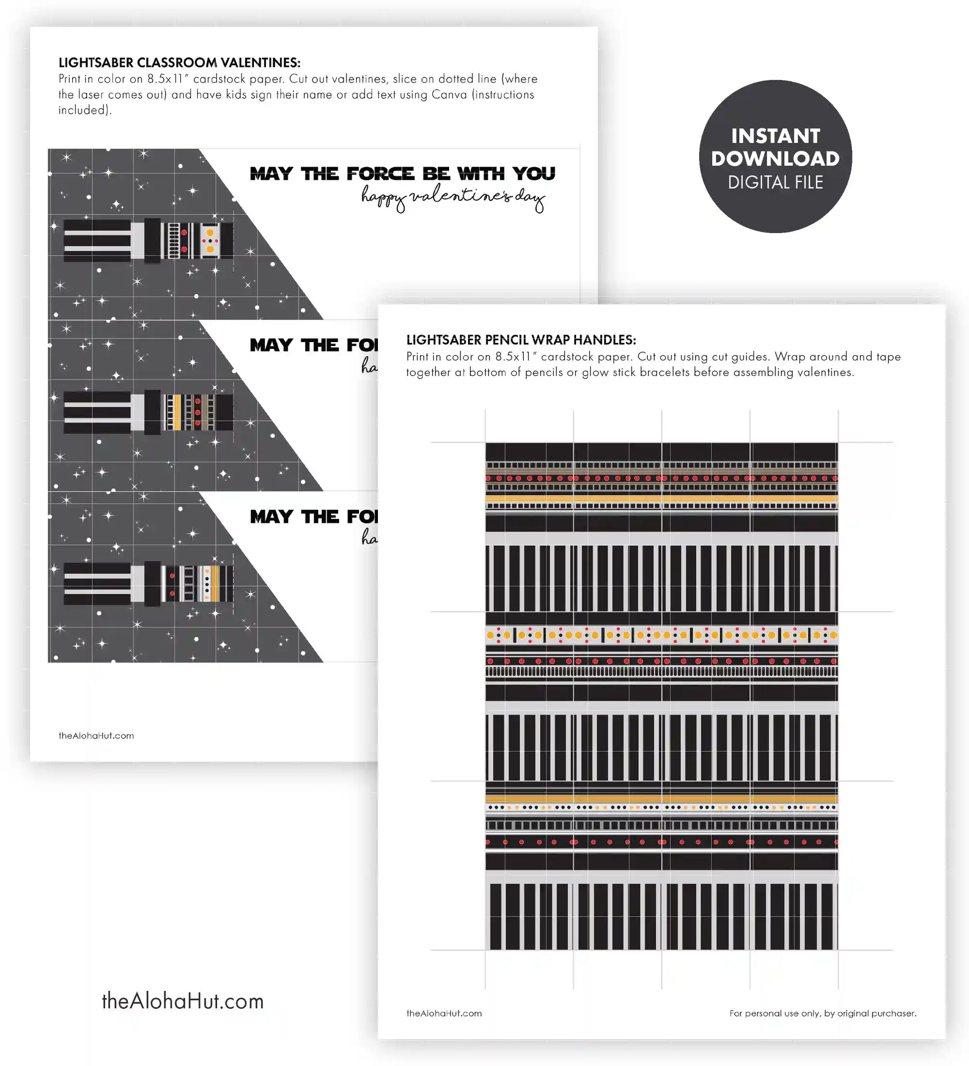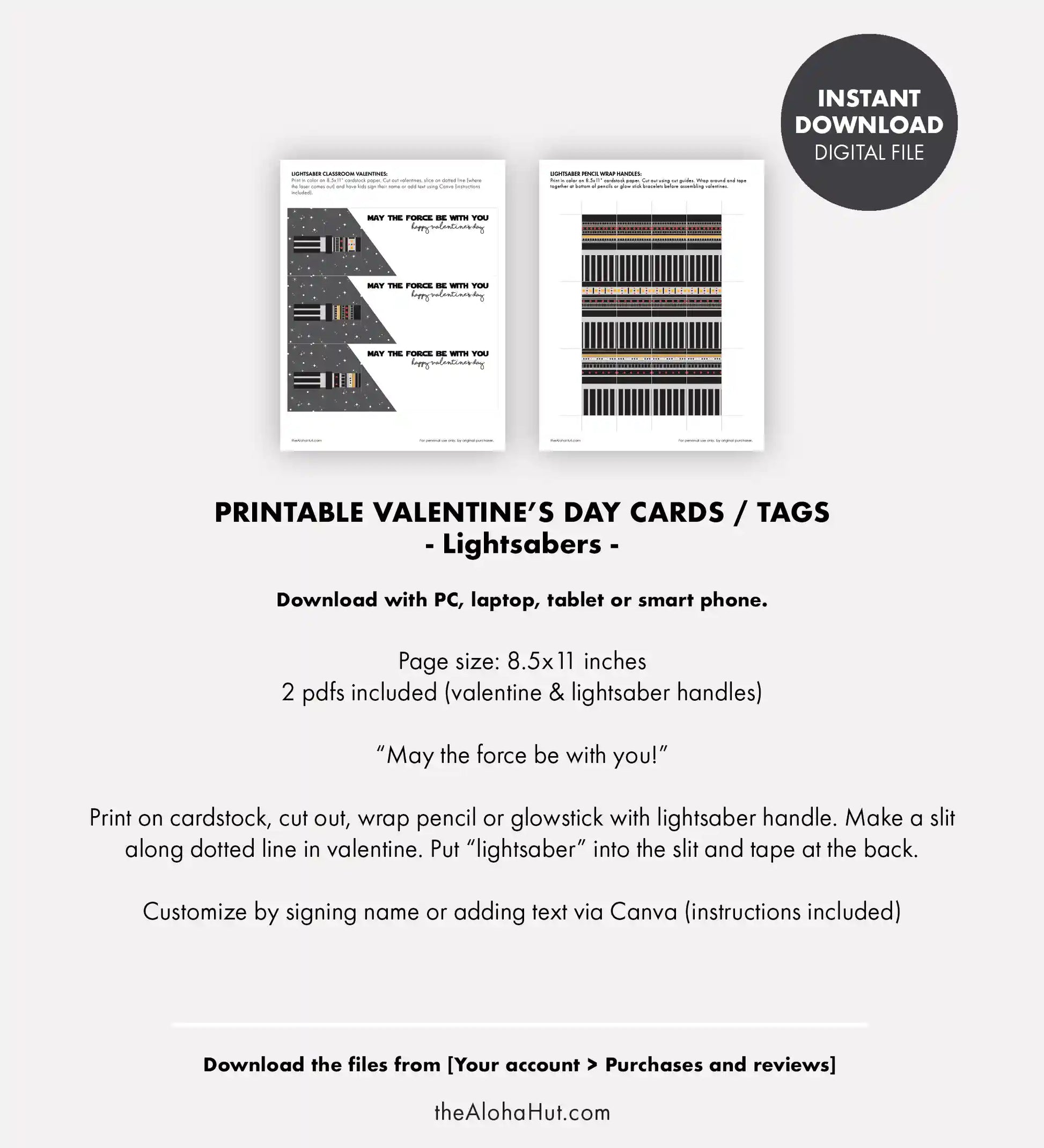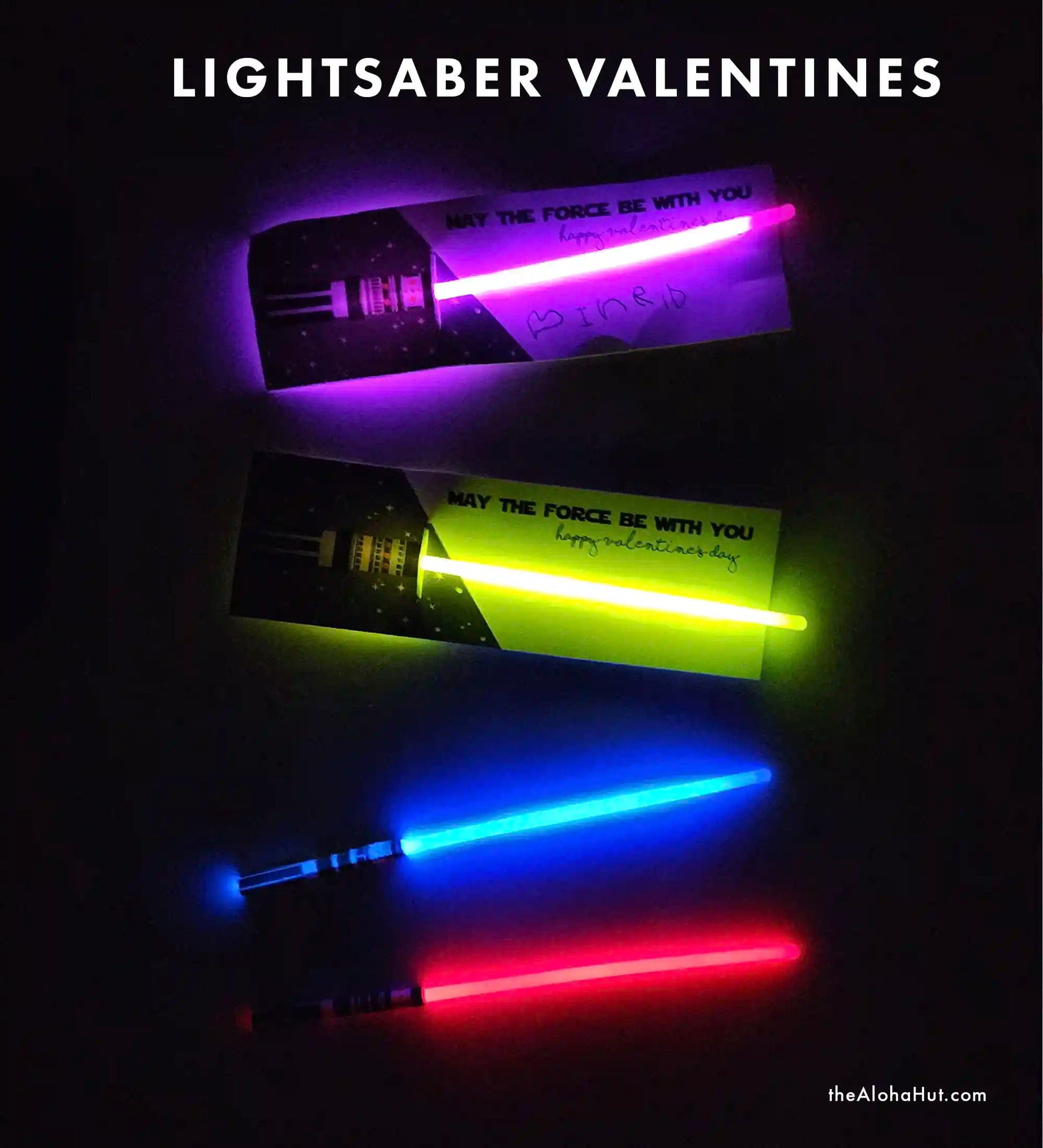 Looking for fun kids valentines and easy school valentines you can print from home? These printable Star Wars Lightsaber valentines are perfect for a class Valentine's Day party, as a gift to friends, or a unique valentine card for your school classmates. Works great for boys and girls and the perfect last minute valentine because you can attach them to anything you want!
