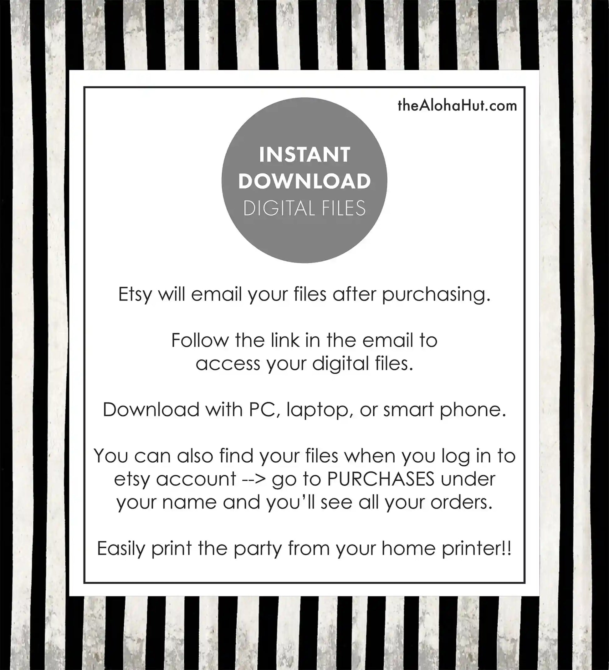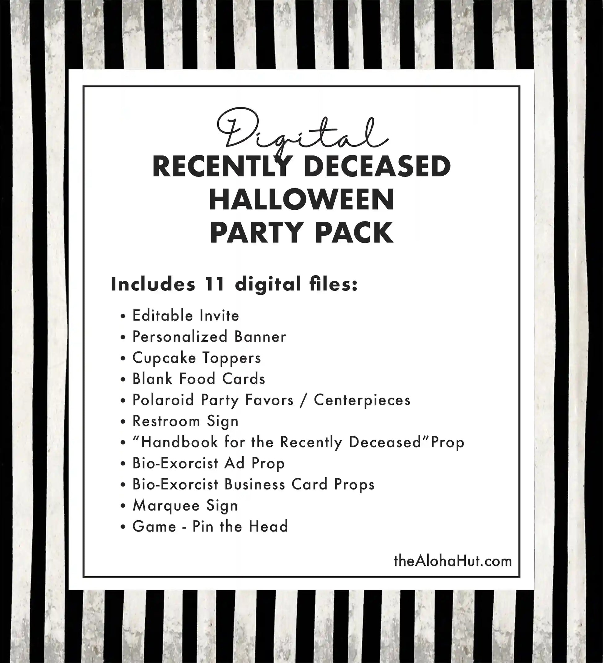 Printable Halloween party pack for an easy Beetlejuice themed birthday party, Halloween party, or movie night. This pack is chock full of everything you need to decorate for an eerie Halloween party! From the invitation to the decor to games, this pack has it all! Purchase, download, and print from home!
